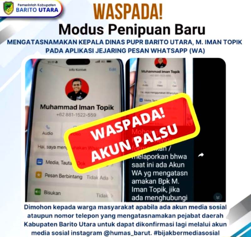 Beberapa waktu lalu ada modus penipuan melalui media sosial baik itu WhatsApp (WA) maupun akun Facebook (FB) akun Instgram (IG) yang mengatasnamakan Penjabat Bupati Barito Utara Drs Muhlis, Pj Sekda Barito Utara Drs Jufriansyah, dan kini mengatas namakan Kepala Dinas Pekerjaan Umum dan Penataan Ruang (PUPR) Barito Utara, M Iman Topik, Minggu (18/2/2024).